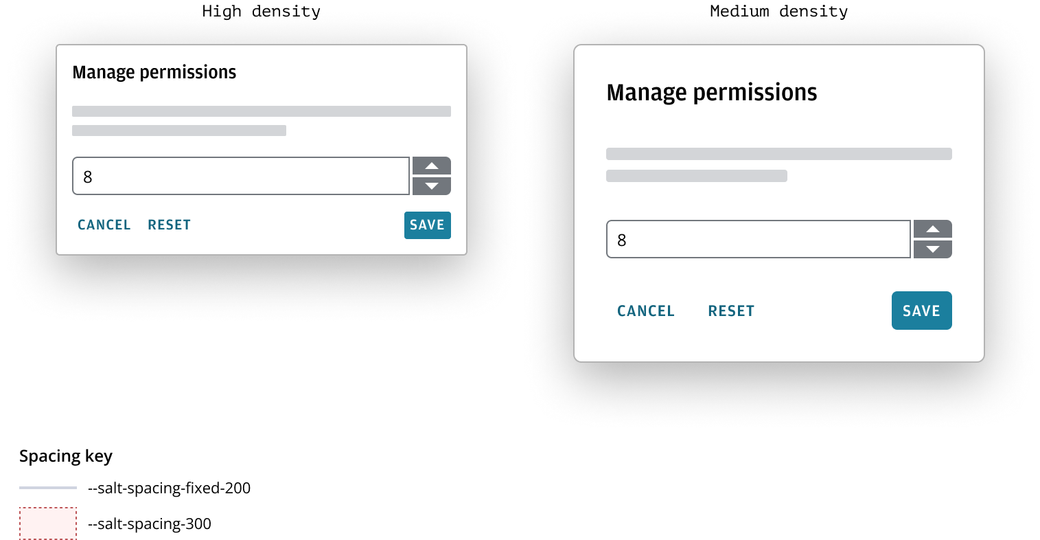 Fixed spacing offers tokens with values that stay the same across all densities. For instance, --salt-spacing-100 is consistently 1px, and --salt-spacing-200 is 2px, no matter the density. This provides a stable reference for design elements needing uniform spacing, ensuring consistency and simplicity within the design system.