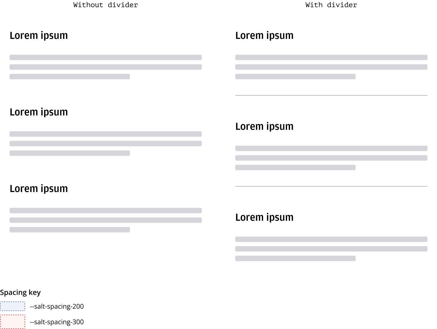 Horizontal dividers help segment layout regions and should be spaced consistently with --salt-spacing-300 above and below sections. For more details on dividers, please refer to the Divider.